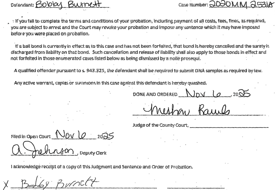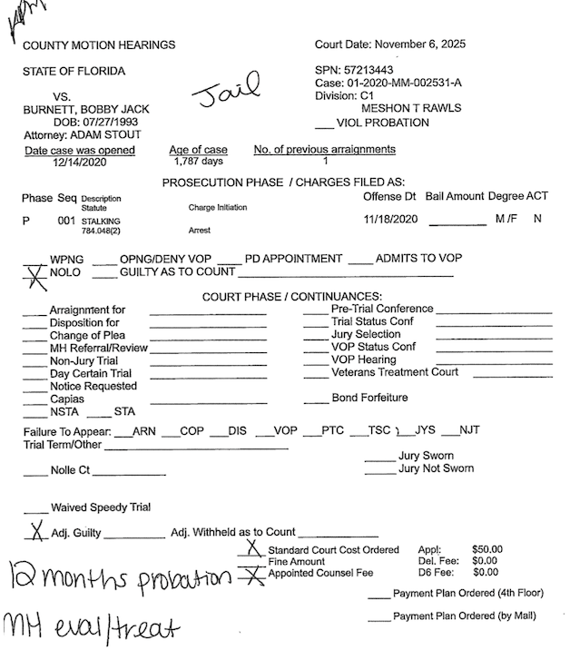 On November 6, Bobby Jack Burnett, 32, was convicted of misdemeanor stalking and sentenced to one year of probation.