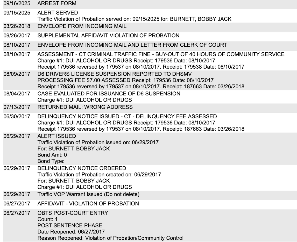 Burnett also has a drunk driving case dating back to 2016, for which he was arrested, convicted and sentenced to one year of probation. However, the case was resolved alongside his stalking case because he violated his probation in 2017 and never answered for it until his stalking warrant was served.