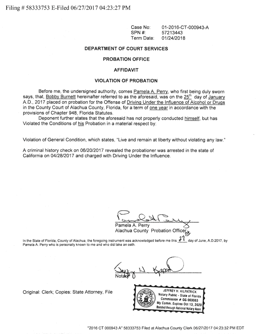 Under the conditions of his probation, Burnett is not allowed to engage in any criminal activity, but he did when he was arrested for drunk driving in the State of California on April 28, 2017.