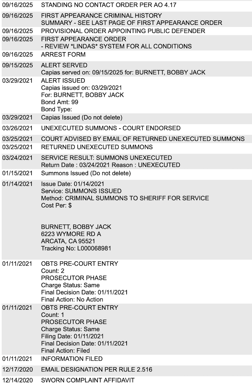 According to his stalking sworn complaint, Burnett still had a registered address in California at the time of the incident. The sworn complaint doesn't say the reason Burnett was not arrested, and there are no dockets in between the warrant's issuance in 2021, and Burnett's arrest in 2025, making it difficult to confirm his whereabouts after he was charged with stalking. It hasn't been verified if he fled back to his home-state or went to another location.
