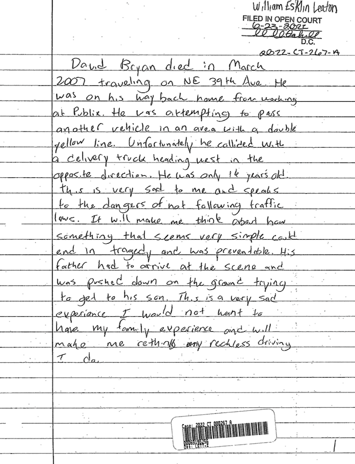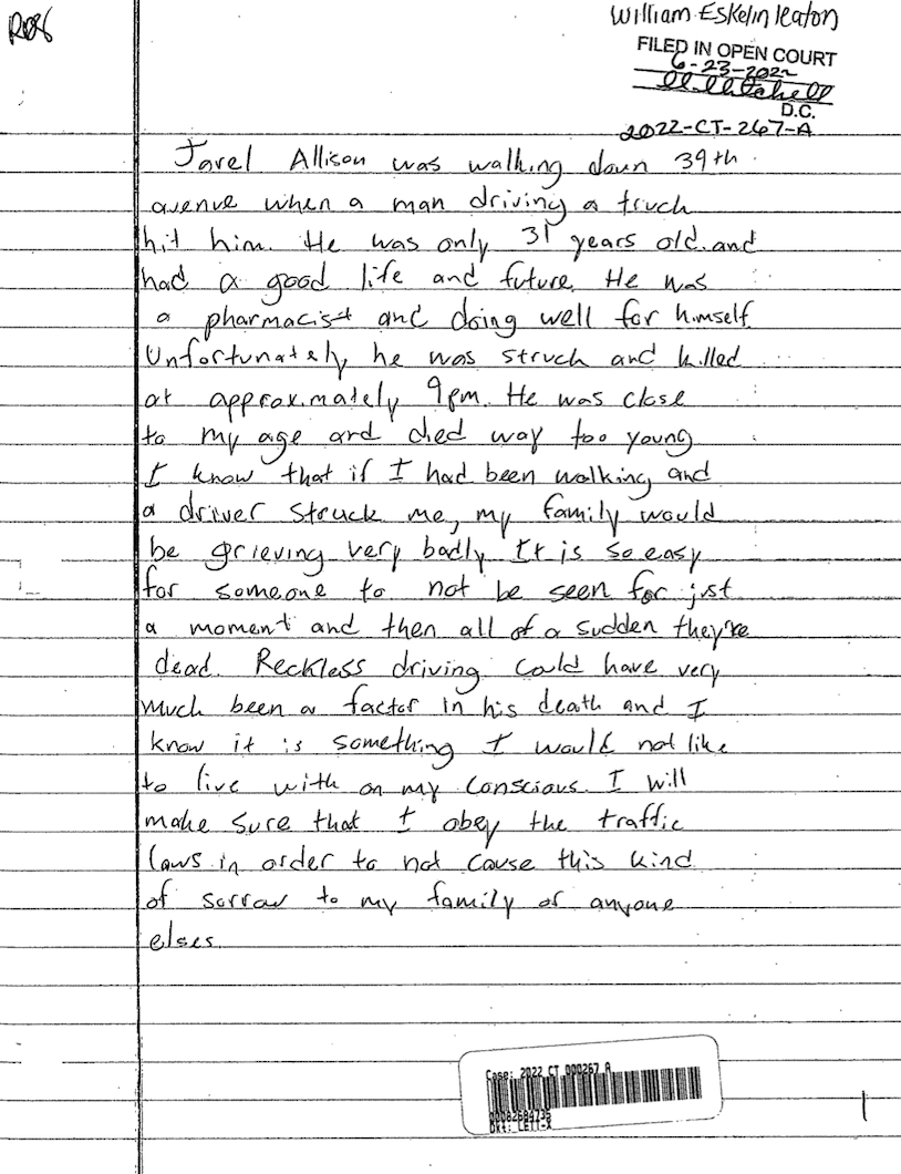 Eskelin-Leaton was previously charged with a criminal traffic citation for reckless driving in 2022. Prosecutors filed the charge but later dropped it after Eskelin-Leaton submitted letters about vehicular homicides he read about and how it encourages him to drive safely.
