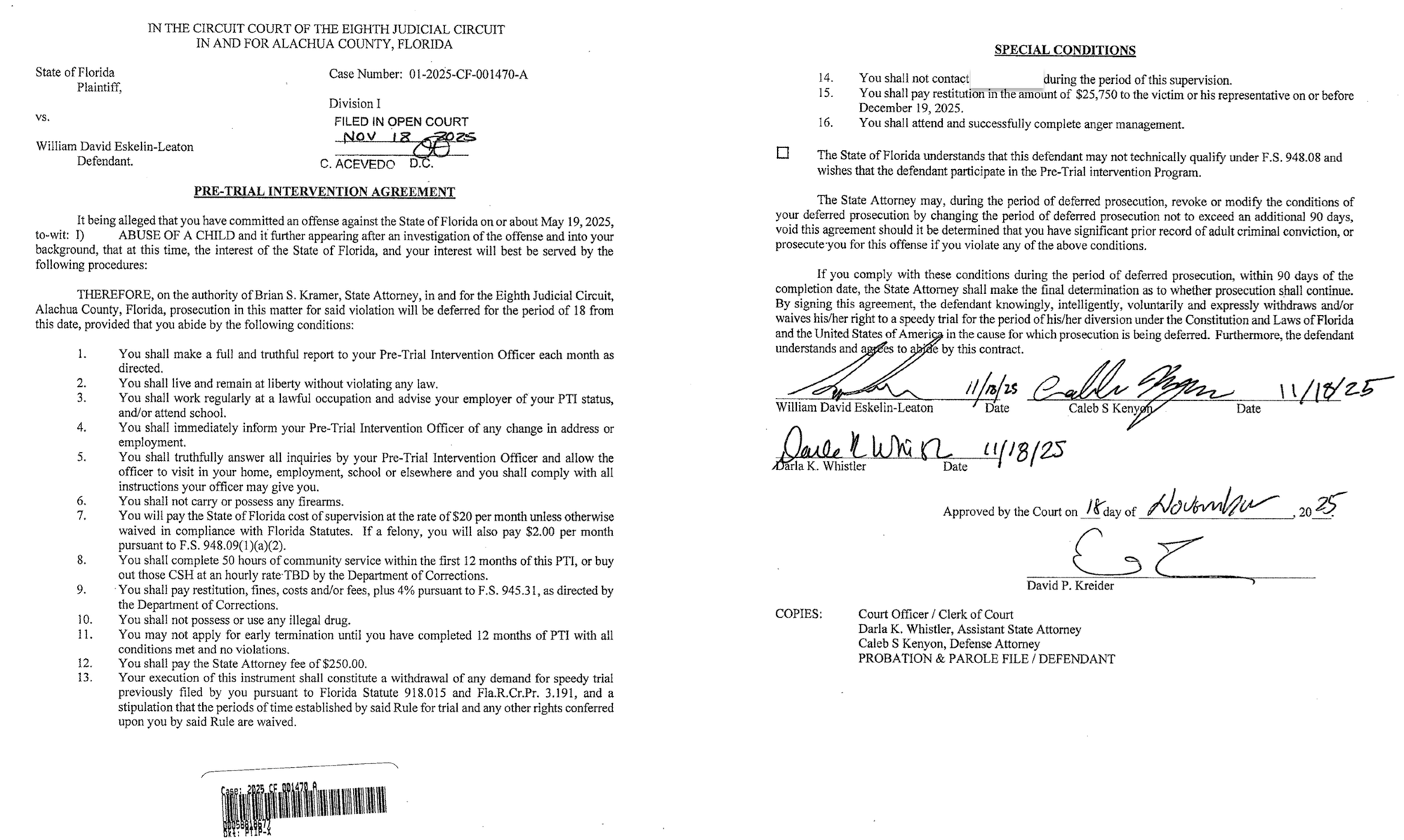 The agreement states, "It [is] being alleged that you have committed an offense against the State of Florida… Abuse of a child, and it further appearing after an investigation of the offense and into your background, that at this time, the interest of the State of Florida, and your interest will best be served by [this agreement]. Therefore, on the authority of Brian S. Kramer, State Attorney, in and for the Eighth Judicial Circuit, Alachua County, Florida, prosecution in this matter for said violation will be deferred for the period of 18 [months] from this date, provided that you abide by the [agreement].”