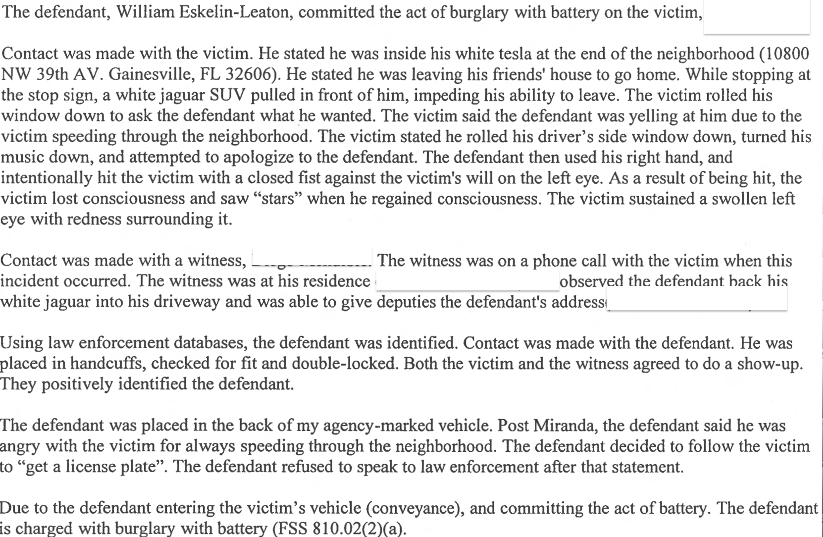 The incident occurred on May 19 when the 16-year-old victim was in his white Tesla at the end of a neighborhood after leaving his friend’s house. While stopped at a stop sign, a white Jaguar SUV pulled up in front of him, impeding his ability to leave. The victim told Alachua County Sheriff's Office (ACSO) deputies that Eskelin-Leaton was yelling at him for speeding through the neighborhood. After exiting the Tesla, Eskelin-Leaton punched the victim in the face, causing him to lose consciousness and leaving him with a swollen left eye.