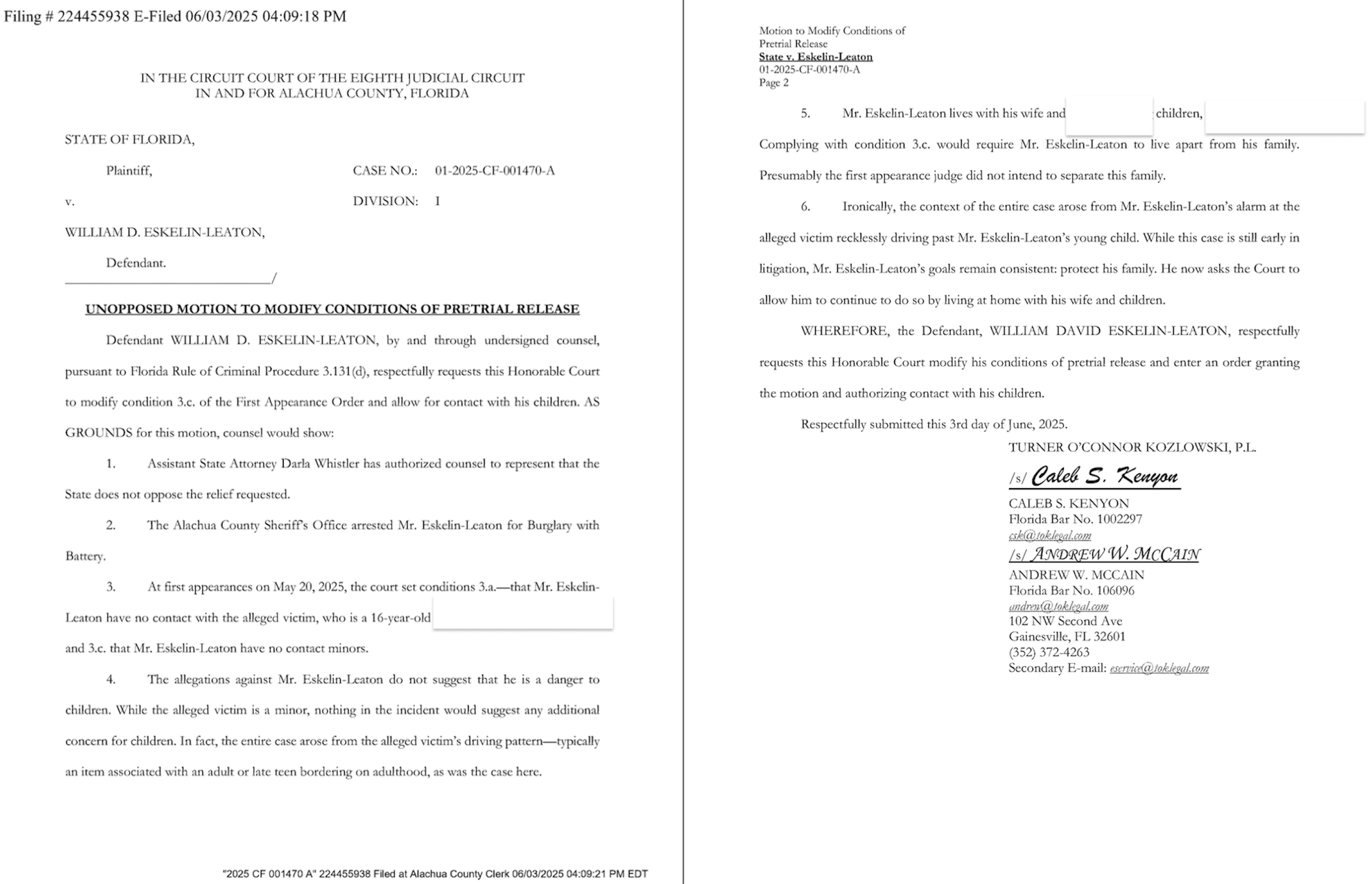 Eskelin-Leaton was released from the Alachua County Jail on a $15,000 bond shortly after his arrest with conditions to not have contact with the victim or any minors, prompting his lawyers, Caleb Kenyon and Andrew McCain, to submit a pretrial release modification motion so he could have contact with his children.