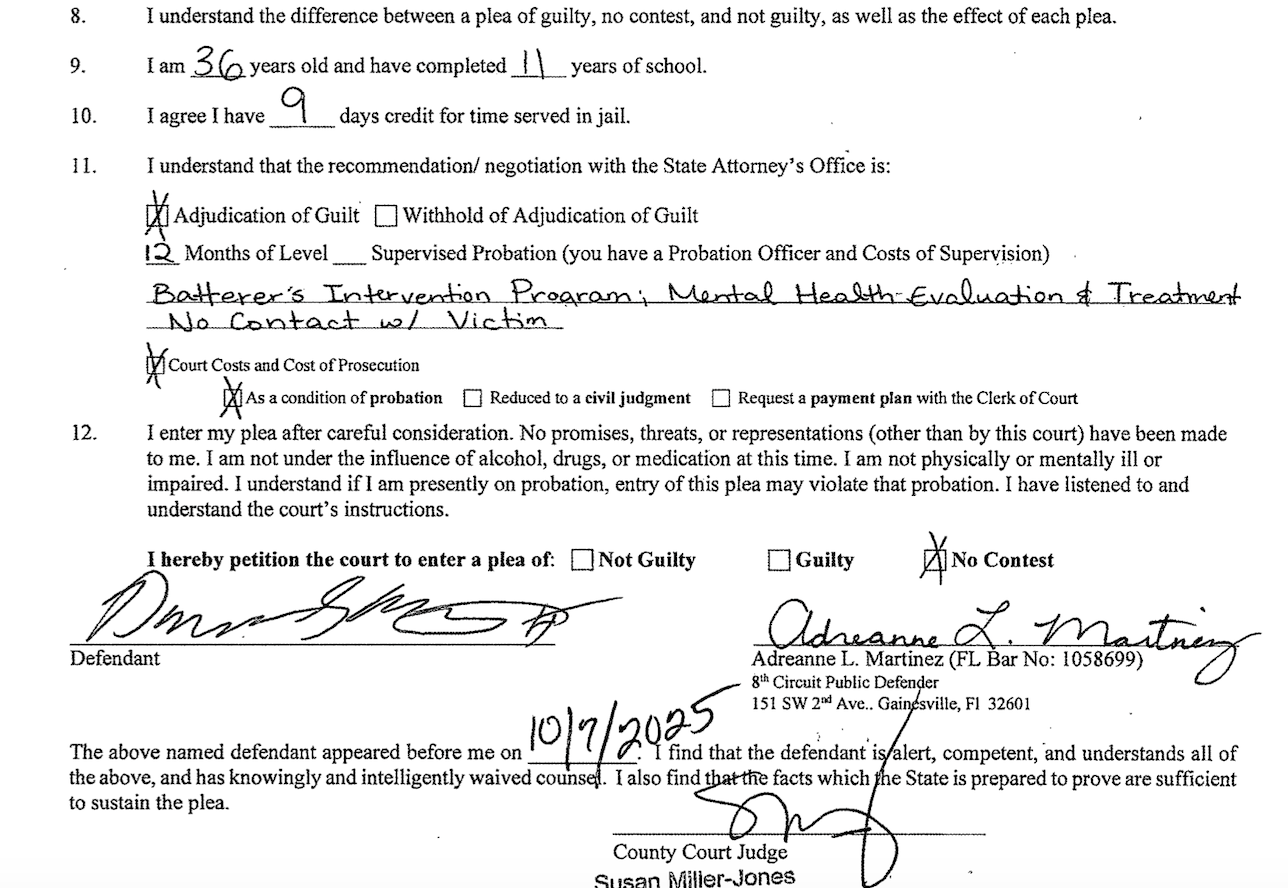 According to the police report, on September 7, 2024, Gainesville Police Department Officer George Connolly responded to the victim’s residence after getting reports of a domestic disturbance. Connolly arrived on the scene to find Hunt with Officer Carl Leibrandt.