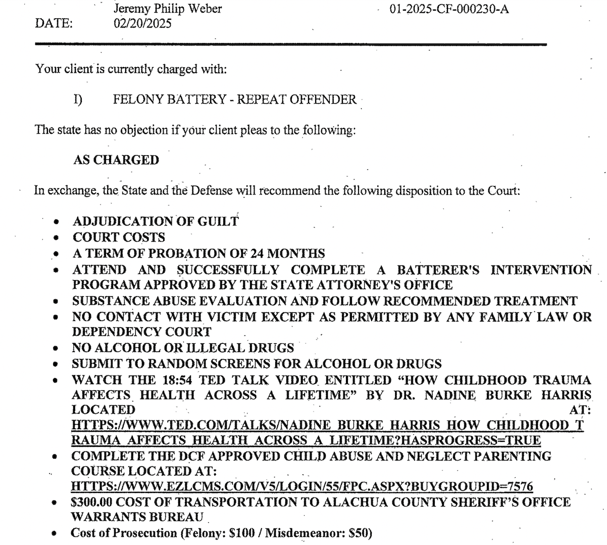 Jeremy Phillip Weber, 35, was found guilty of felony battery by a repeat offender last week and sentenced to two years of probation.
