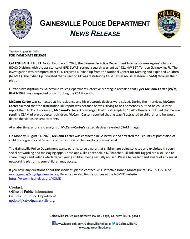 In February 2023, when McCann-Carter's residence was being searched by officers, he claimed he was attempting to “bait somebody out” so he could report them to the messaging app Kik.