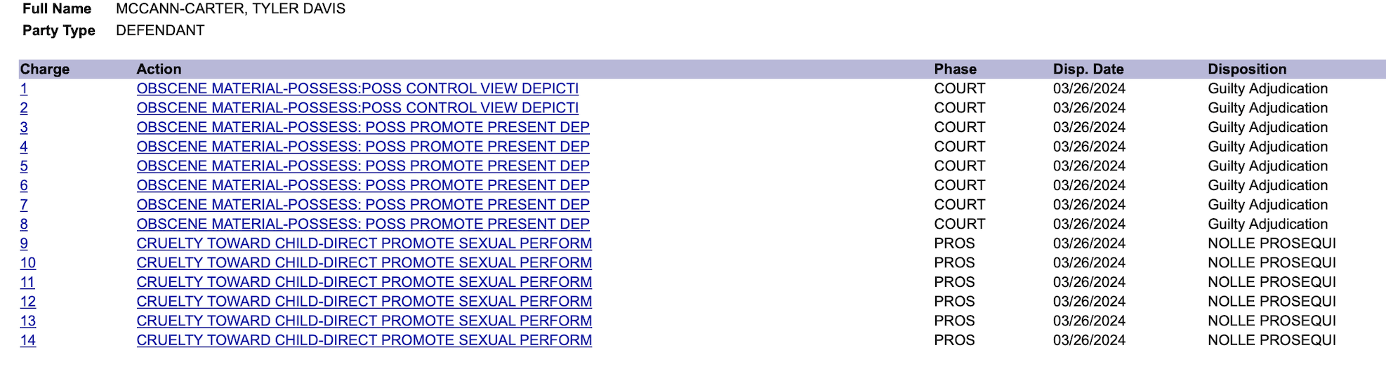 In March 2024, McCann-Carter was sentenced to five years in prison following a no contest plea and conviction of eight counts of possessing child sexual abuse material (CSAM).
