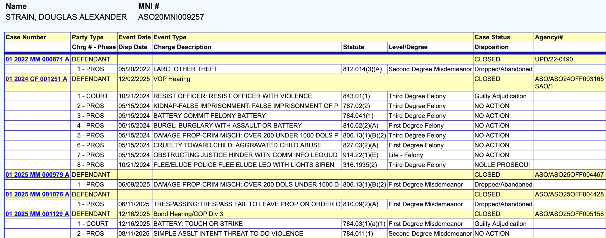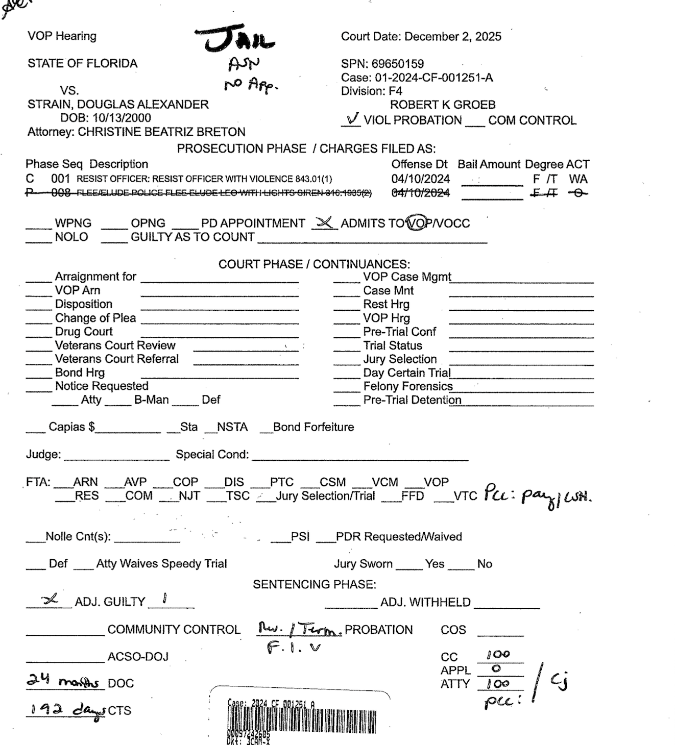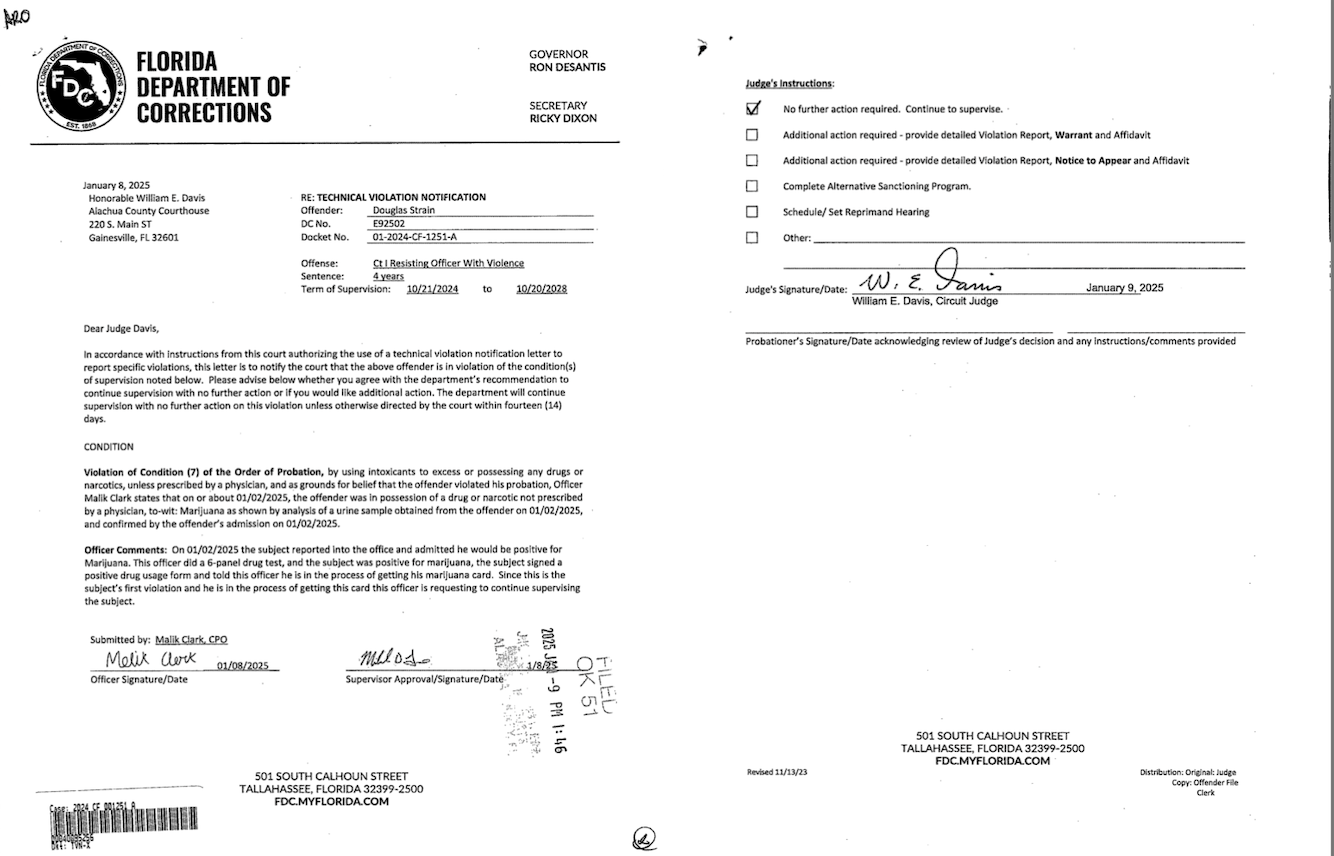 Due to committing new criminal acts, Strain was sentenced to two years in prison with time served credit for violating his probation on December 2, 2025. His sentence for battery is running alongside his prison sentence. The probation violation undid his withheld adjudication for resisting and turned it into a conviction.