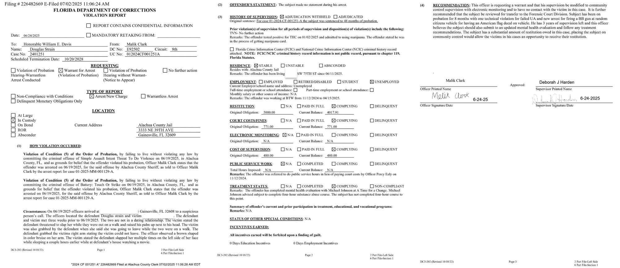 Strain's probation violation affidavit report shows that he previously worked at Gator BTW from November 2024 until April 2025. The form also shows that a mental health professional recommended Strain take a four hour substance abuse course but he had not completed one.