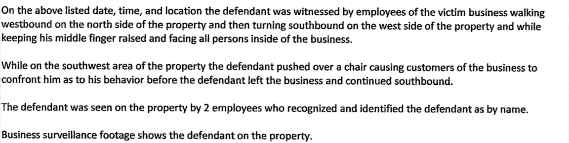 The sworn complaint alleged that Strain caused a disturbance in the business by knocking over a chair and raising his middle finger, causing customers to confront him, getting him to leave. Police observed Strain on the property on surveillance footage.