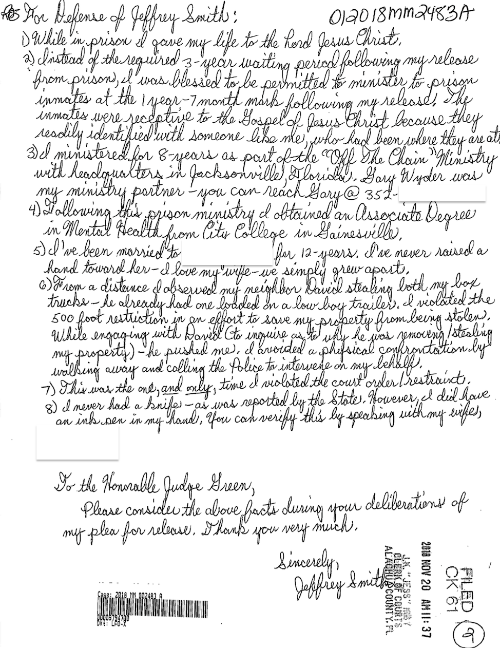 According to a letter Smith sent the Court in his 2018 injunction case, after he was released from prison, he was allowed to minister to inmates. Smith said the inmates were "receptive" to the "Gospel of Jesus Christ" because they "identified with someone" like him. Smith said he went on to minister for eight years with the Jacksonville based "Off the Chain" Ministry, a group offering "second chances" and "spiritual guidance" to incarcerated and formally incarcerated men, their website states. Smith added that he obtained an associate degree in mental health from Gainesville City College (closed as of 2024).
