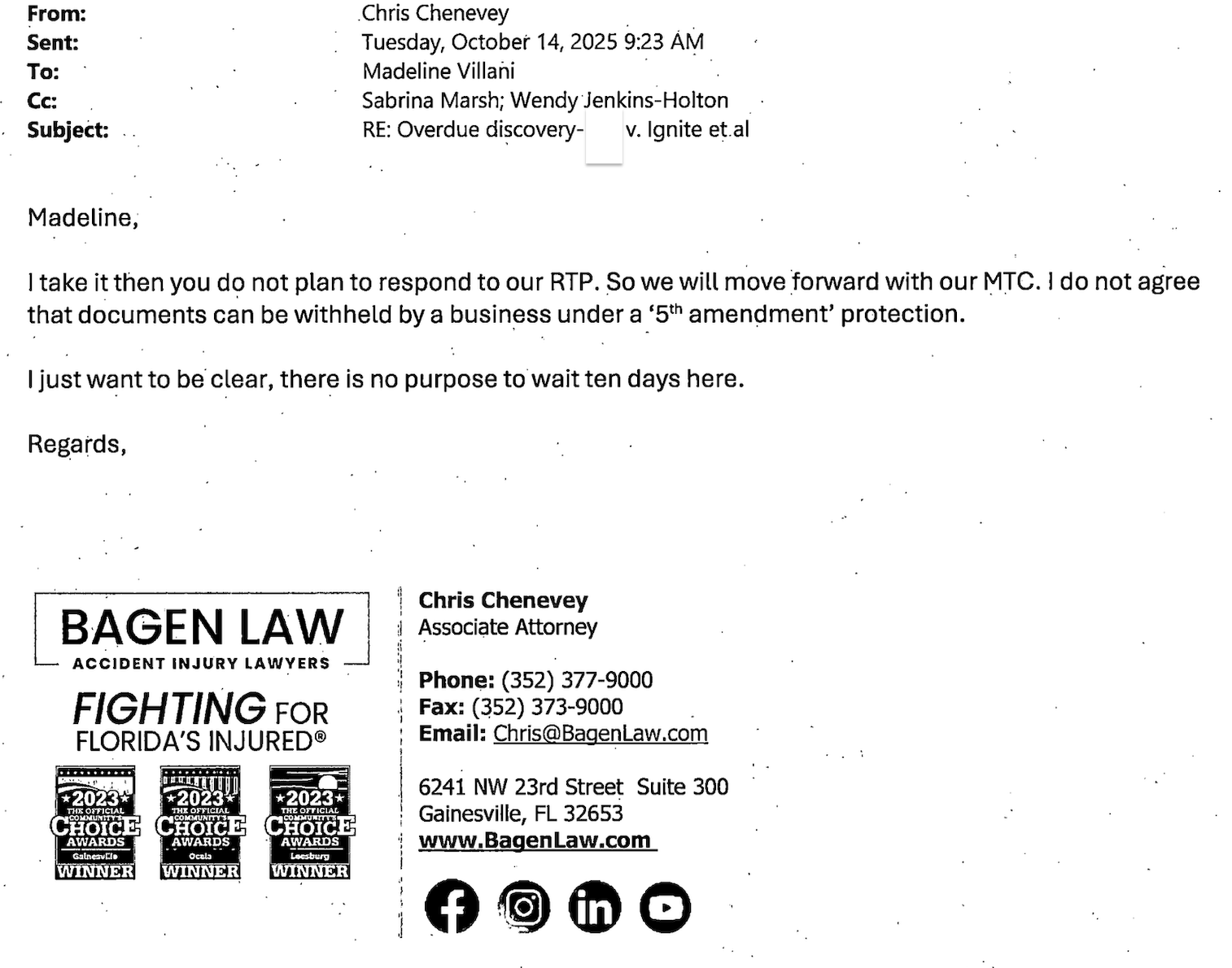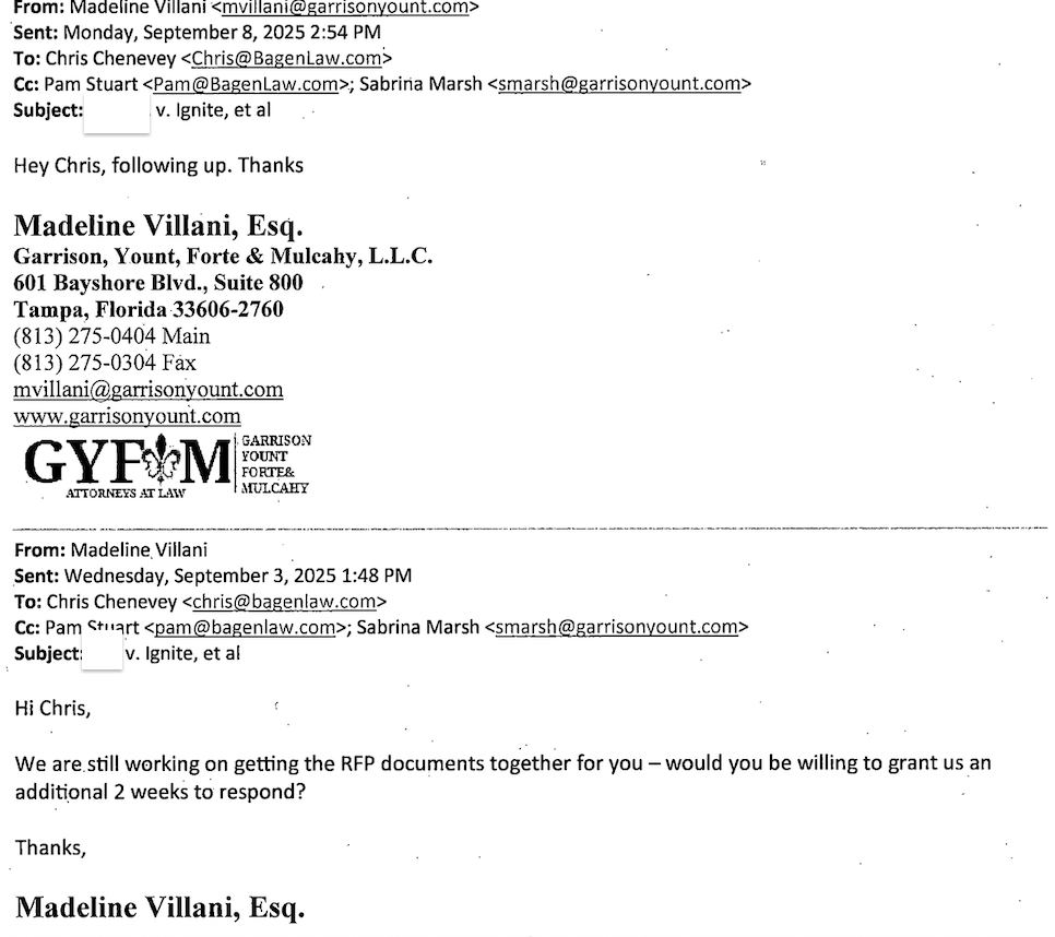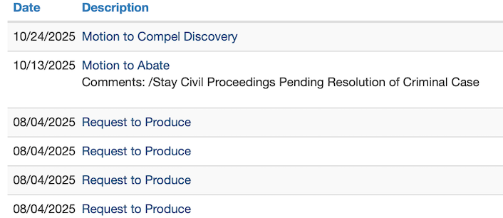 On October 13, 2025, ILC’s lawyer Madeline Villani of the Garrison Yount Forte & Mulcahy Law Firm, filed a motion to abate, i.e. pause the lawsuit arguing that Vega could incriminate himself.