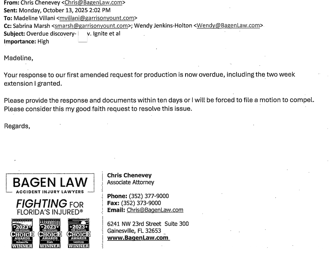 The newly filed evidence complement motion is effectively an attempt on Chenevey’s part to force ILC to release evidence because they’re refusing. The document contains copies of email correspondences between Villani and Chenevey.