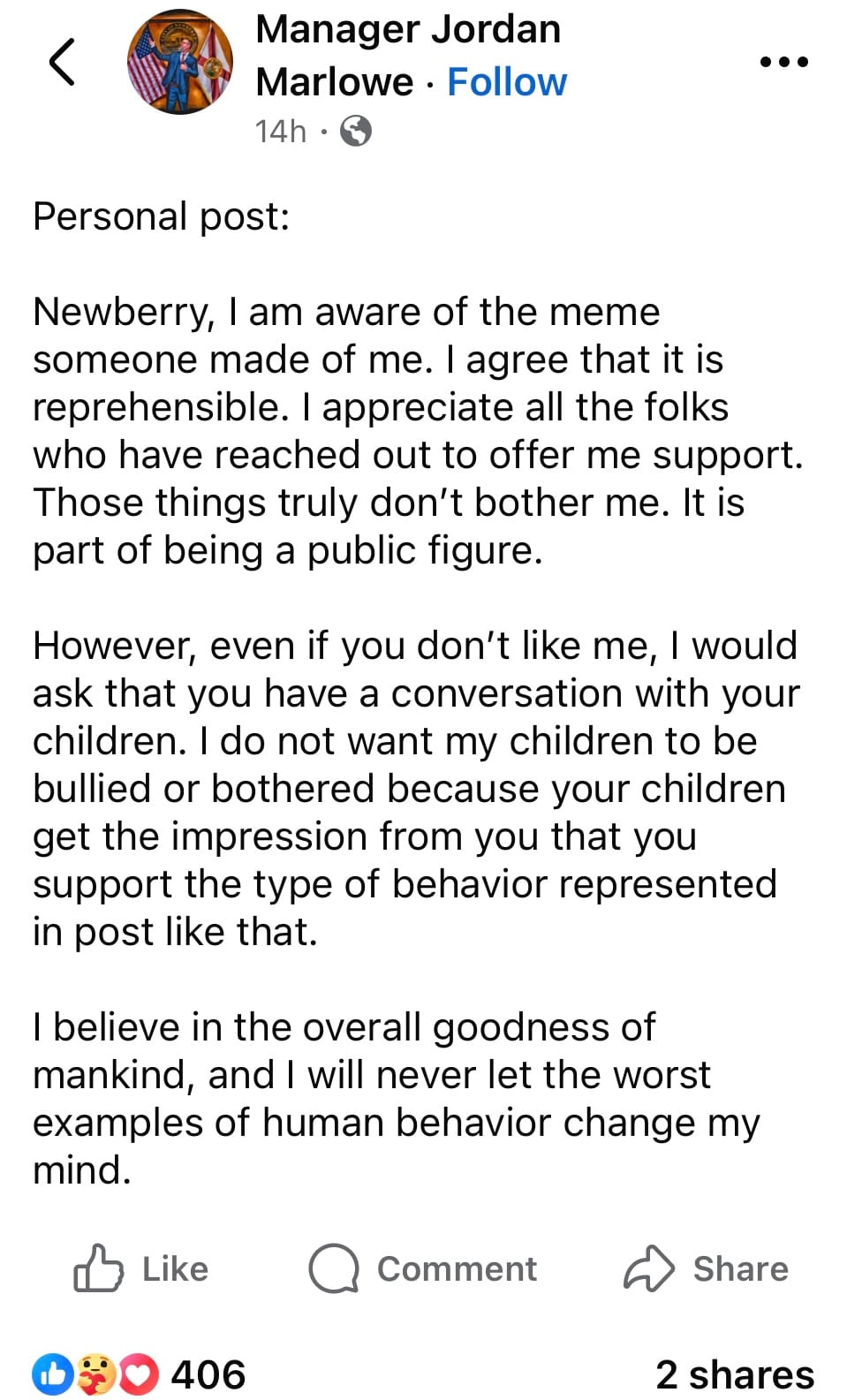 On October 16, Newberry City Manager Jordan Marlowe made a Facebook post condemning a meme made with Artificial Intelligence (AI) that depicted him sitting at a table eating pizza with convicted Newberry sex offender Joel Searby and deceased international sex offender Jeffrey Epstein.