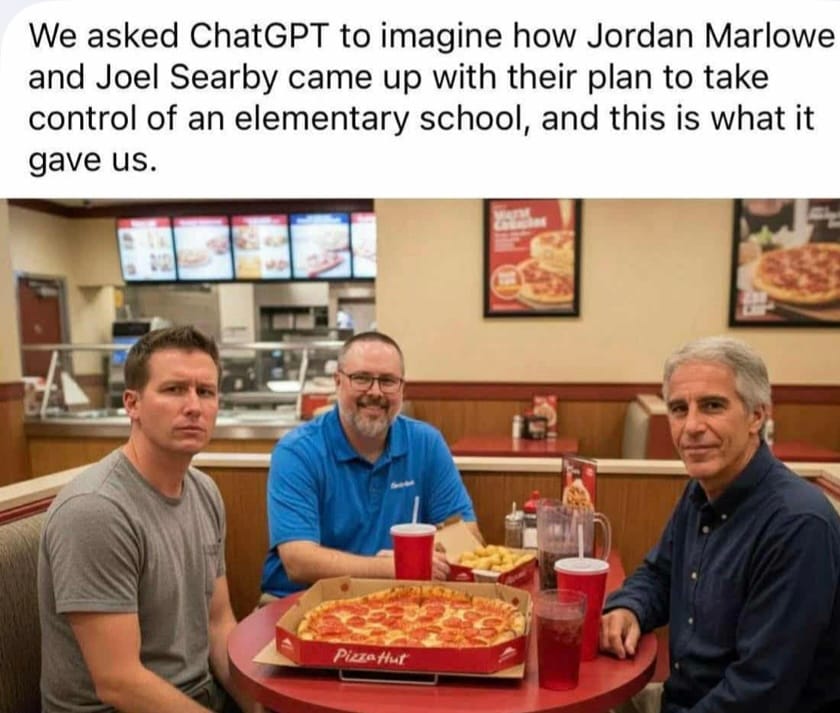 Searby was a leader in the movement to turn Newberry Elementary School into a charter school until his arrest for grooming a minor. Epstein obviously had no part in Newberry affairs, and the creator of the image appeared to add him due to his infamy for sexually abusing minors. The creator of the meme prompted the image to depict Marlowe next to Searby and Epstein even though he has never committed such crimes.
