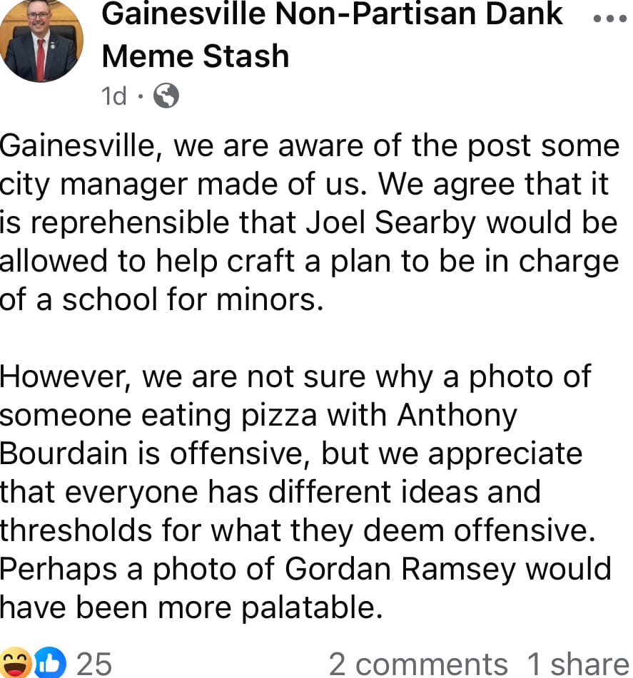 The AI meme appears to have originated from the Facebook account Gainesville Non-Partisan Dank Meme Stash. The account no longer has the photo on their page, but they have many memes that are a similar style, and a post that appears to be a response to Marlowe’s statements, saying, “We are not sure why a photo of someone eating pizza with Anthony Bourdain is offensive.”