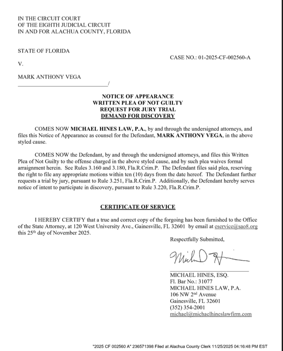 The same day, Vega’s lawyer, Michael Hines, filed a notice of appearance, a demand for discovery, a plea of not guilty and a request for a jury trial.