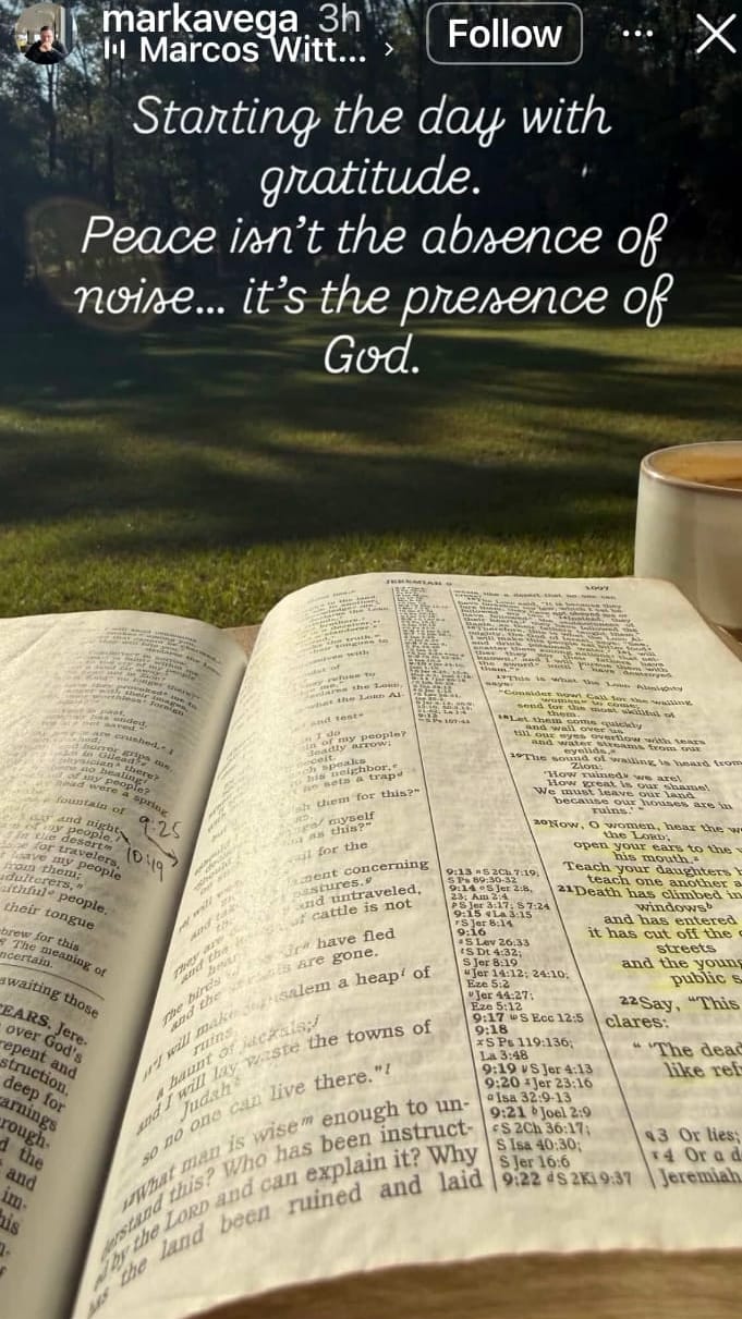 The day after his arrest, Vega made a story post on Instagram that showed him reading a Bible. The post states, “Starting the day with gratitude. Peace isn't the absence of noise... it's the presence of God.”