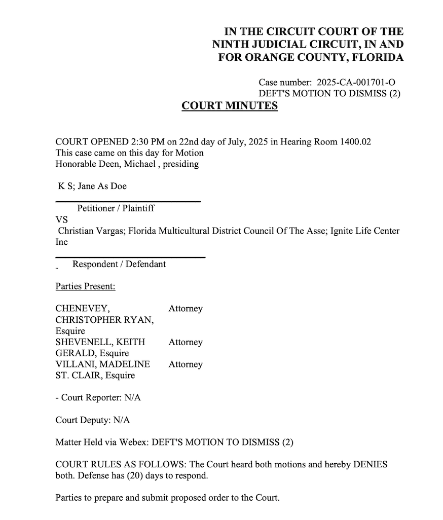 ORANGE COUNTY. On February 28, alleged rapist Christian Vargas was sued for sexual battery. Gainesville church Ignite Life Center (ILC) and Orlando-based Florida Multicultural District (FMD) of the Assemblies of God (AG) are named as co-defendants in the lawsuit, each facing one count of negligence and vicarious liability.