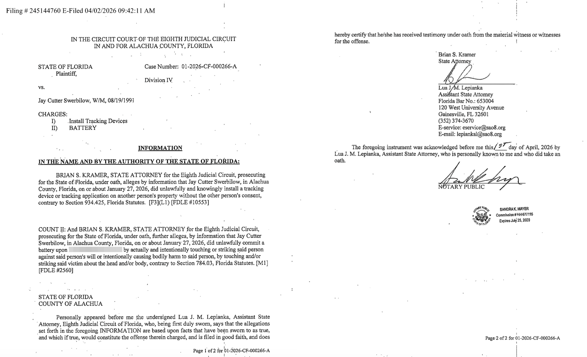 Alachua County Sheriff’s Office deputies booked Jay Cutter Swerbilow, 34, into jail Monday on a warrant for misdemeanor domestic battery and a felony charge for installing a tracking device on person or property without consent.