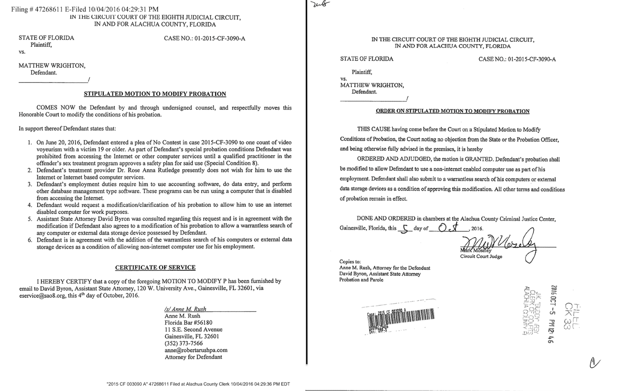 Sentence: In June 2016, Wrighton was sentenced to three years of probation in a plea deal. A few months later he made a motion to modify his probation.