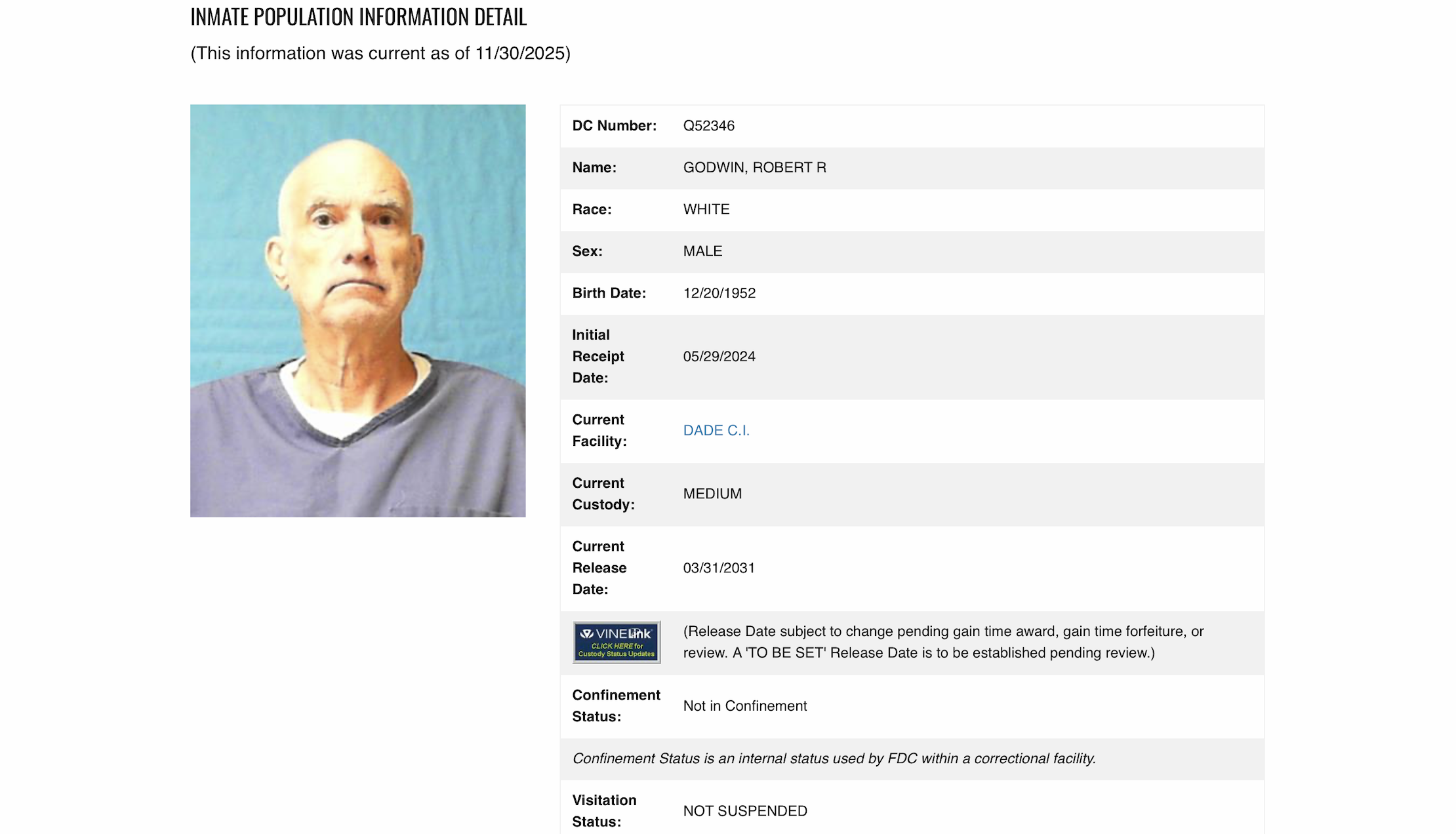 Godwin is currently housed in the Dade Correctional Institute.