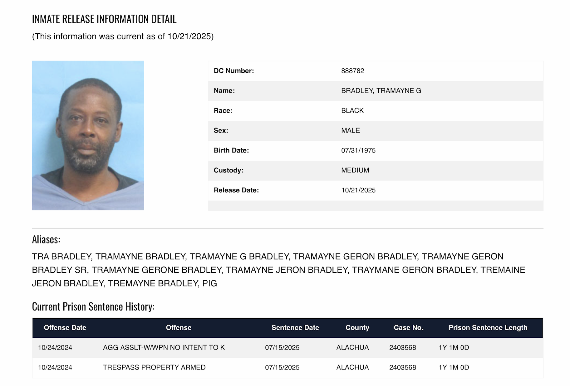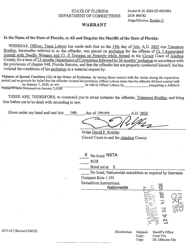 This morning prosecutors with the Eighth Judicial Circuit State Attorney’s Office filed a pretrial detention motion against Tramayne Geron Bradley, 50, who faces charges of grand theft, two counts of violating a stalking injunction and two counts of burglary.