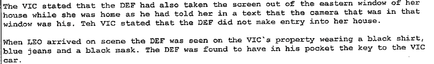 Bradley reportedly was still on the property when police arrived and wearing a black mask. Gainesville Police Department Officer Jesse Herringshaw reported that Bradley "spontaneously stated that the bag of clothes was his and he was just trying to get his property back from the victim. He also stated that he knew he had the no-contact order but just wanted his items."