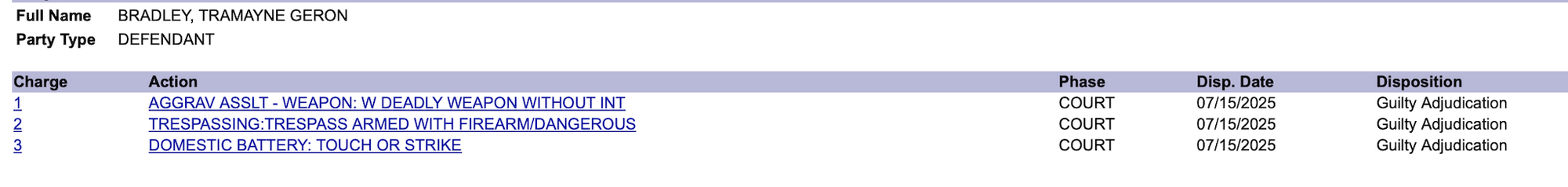 In July 2025, Bradley was convicted of aggravated assault, armed trespassing and domestic battery. He took a no contest plea deal on the charges and was sentenced to 13 months in prison followed by three years of probation. However, Bradley was released from prison in October 2025 due to receiving many days of credit for time served in jail.