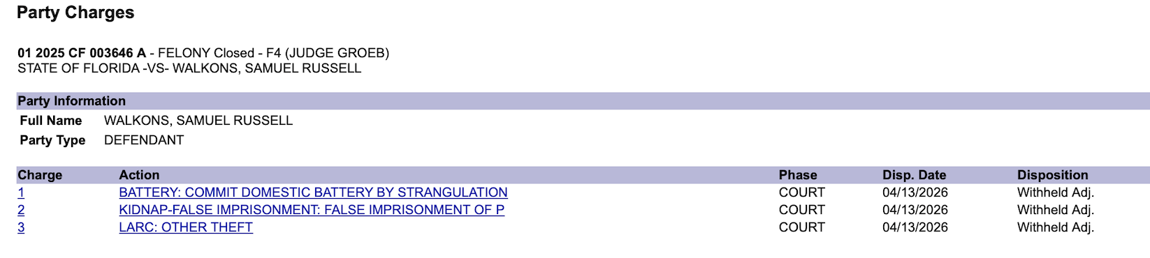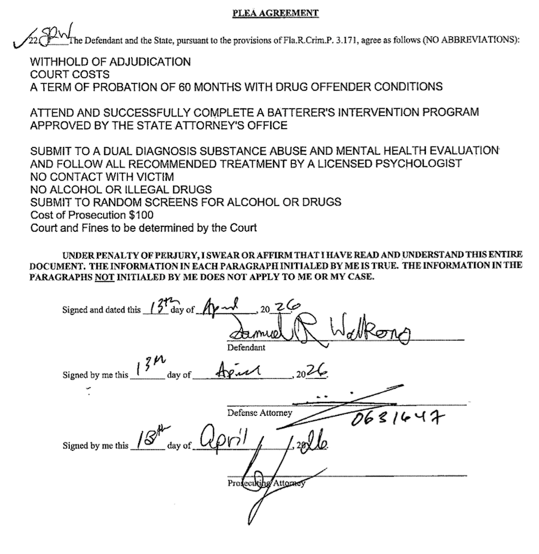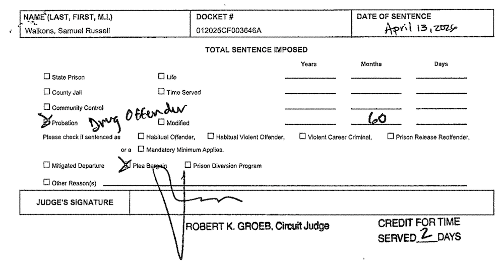Update | April 14, 2026: Yesterday, Walkons took a plea deal in which he received withheld adjudications for the felony charges and a misdemeanor theft charge. He was sentenced to five years of drug probation.