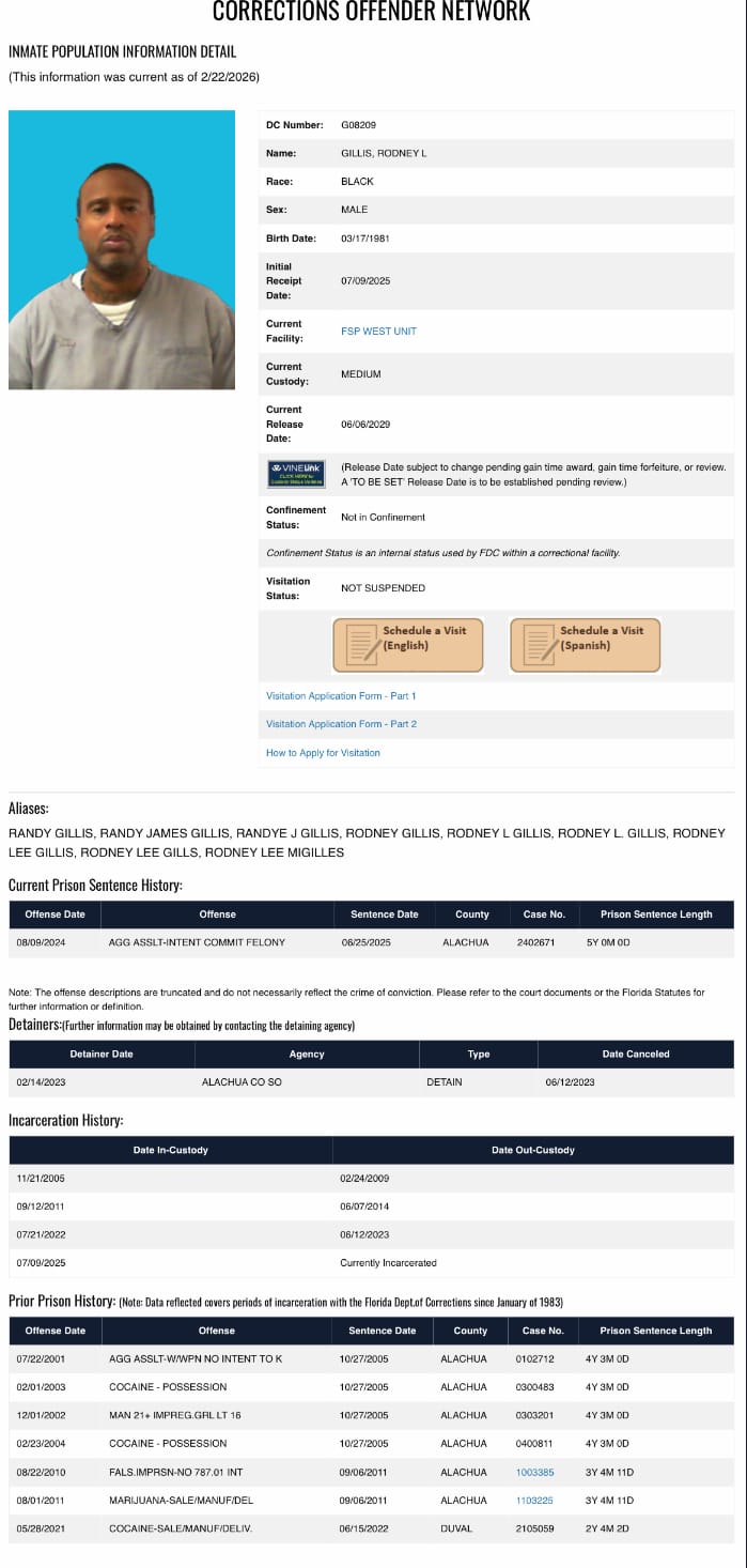 Gillis is serving his sentence in the Florida State Prison West Unit with a scheduled release date of June 6, 2029, as he received credit for roughly a year he spent in jail in pretrial detention.