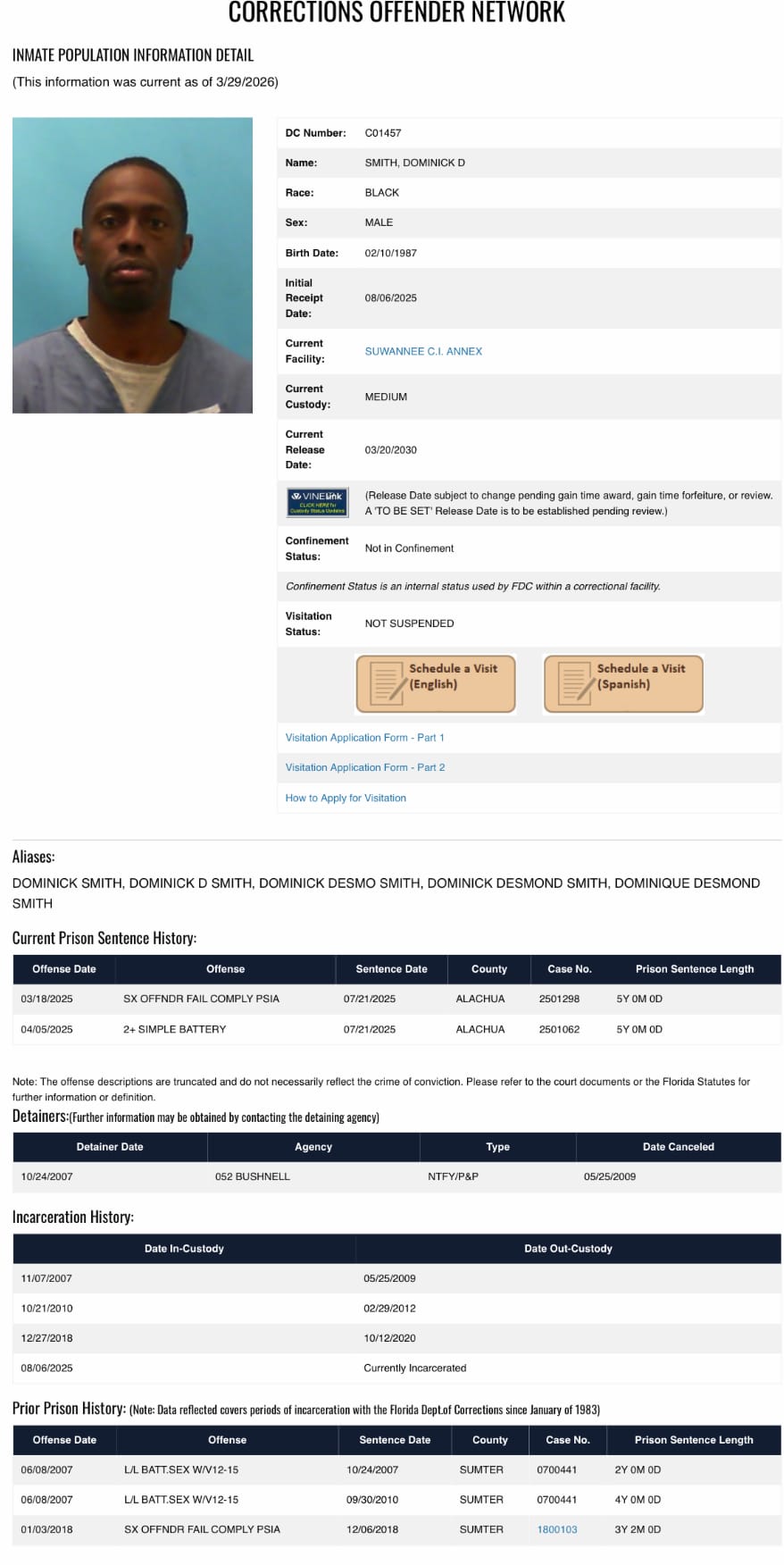 Registered sex offender Dominick Desmond Smith, 37, was arrested on Sunday and charged with battery by a repeat offender (dating violence).