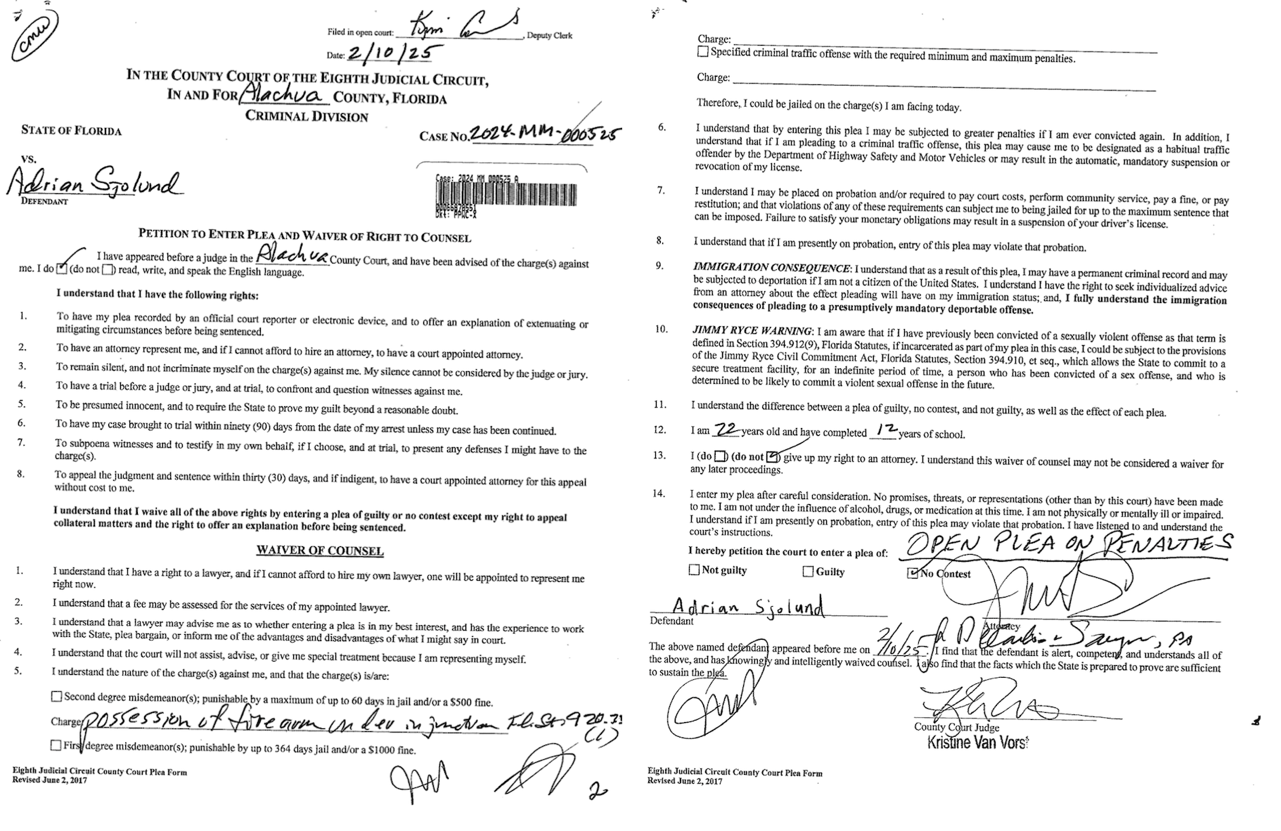 In February 2025, Sjolund entered an open no contest plea, meaning Judge Kristine Van Vorst could do whatever she wanted within sentencing guidelines which was a maximum of one year in jail.