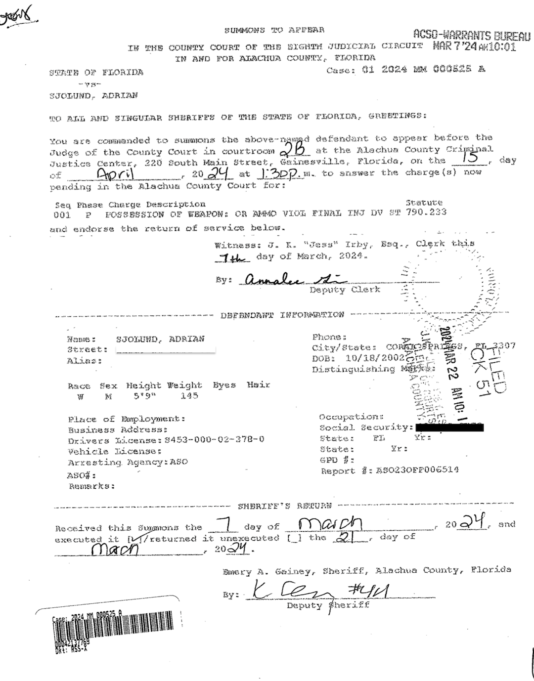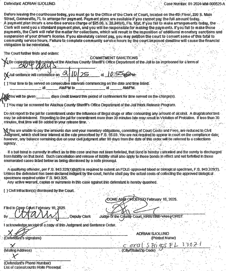 Adrian Sjolund, 23, was released from the Alachua County Jail on November 20, 2025, after serving nine months for violating a firearm possession injunction. Omanovic’s husband Owen Dickinson previously confirmed with GnvInfo that the injunction was for domestic violence in California.
