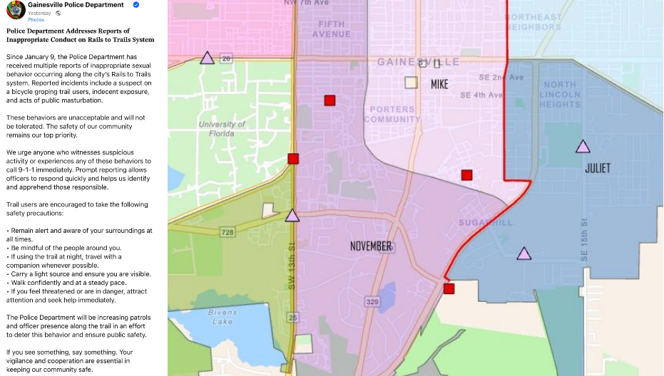 On February 19, the Gainesville Police Department (GPD) made a Facebook post to address numerous reports of sexual offenses occurring on the Rails to Trails path in Gainesville.