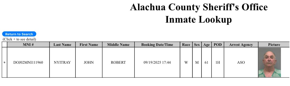 The Alachua County Jail is holding Nyitray without bond following a pretrial detention motion by the State Attorney’s Office that was granted by Judge James Colaw.