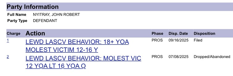 Nyitray’s case was open until prosecutors dropped it on July 8, but they refiled on September 16, court records show.