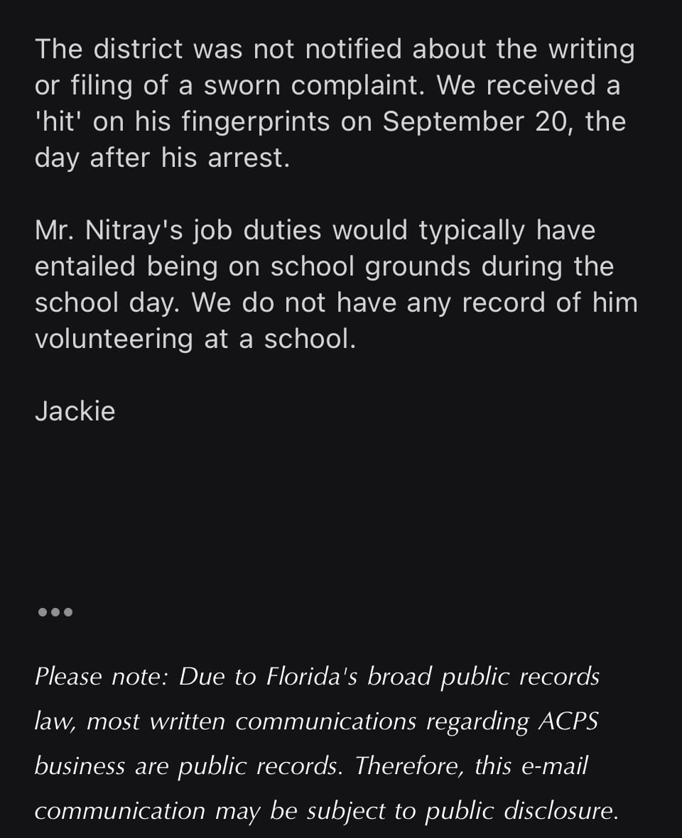 GnvInfo asked ACSO why they didn’t tell ACPS about their investigation into Nyitray. Public Information Officer Chris Sims said ACSO didn’t have information on Nyitray’s employment status because he refused to interview with a detective.