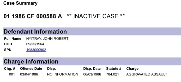 Court records show Nyitray was charged with aggravated assault in 1986, but prosecutors didn’t pursue the case.