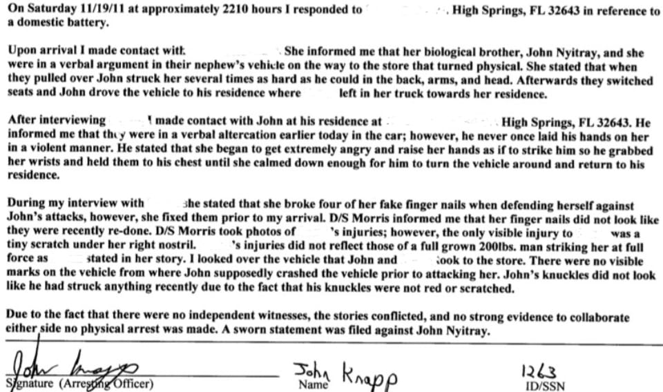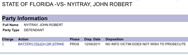 In 2011, Nyitray was charged with misdemeanor domestic battery via sworn complaint but not arrested due to a lack of evidence. The State Attorney’s Office didn’t prosecute the case, with court records stating the victim declined to pursue charges.