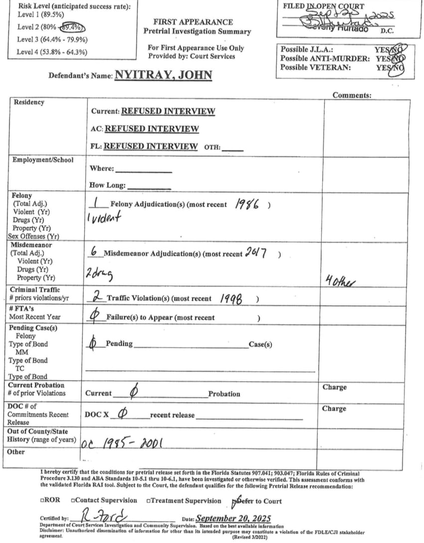 Nyitray has a further criminal record outside Alachua County, as his first appearance pretrial investigation summary states he’s received six misdemeanor adjudications, and Alachua County court records only show two misdemeanor cases. The document indicates Nyitray's out-of-county cases occurred between 1985 and 2001.