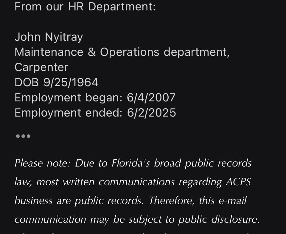 According to Alachua County Public Schools (ACPS) Communications Director Jackie Johnson, Nyitray was employed with the school district as a carpenter in the Maintenance and Operations Department from June 4, 2007, until his retirement on June 2, 2025. This means Nyitray was working as an ACPS employee with an open criminal case for nearly two weeks after it was publicized in court records and over a month after the sworn complaint was written.