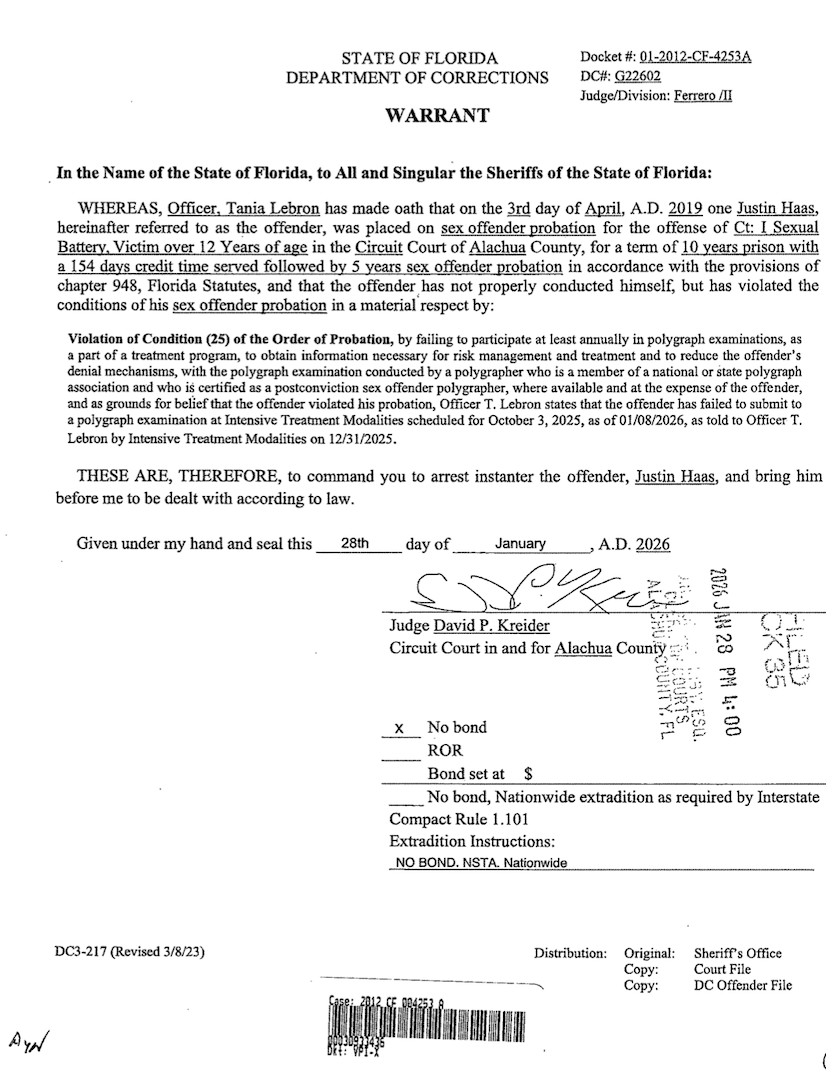 According to the probation violation warrant affidavit, Haas violated his sex offender probation by failing to participate in annual polygraph testing.