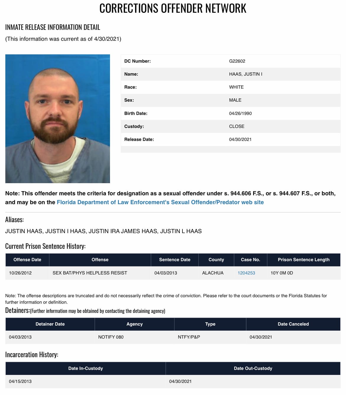 In April 2013, Haas was convicted of a count of sexual battery against a victim over 12 years of age. Taking a plea deal, he was sentenced to ten years in prison followed by five years of sex offender probation.