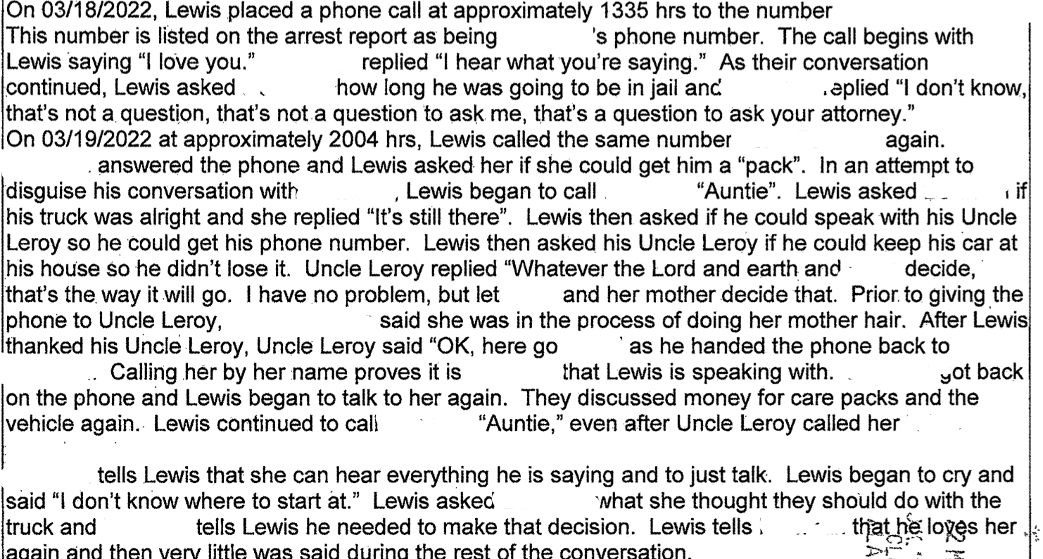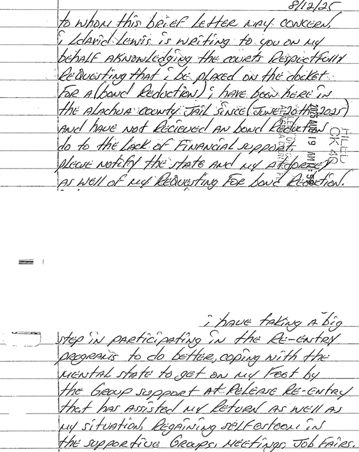 While his case was open, Lewis wrote a letter asking the court for a bond reduction hearing. In the letter, Lewis doesn't talk about specifics pertaining to his case, however, he does speak on wanting to "do better" and support his family, stating release re-entry programs have assisted him.