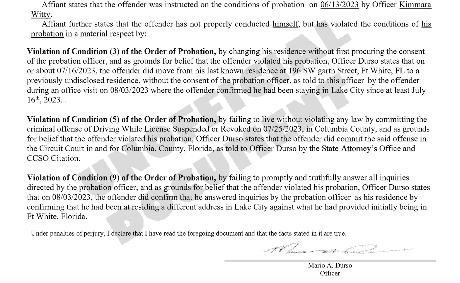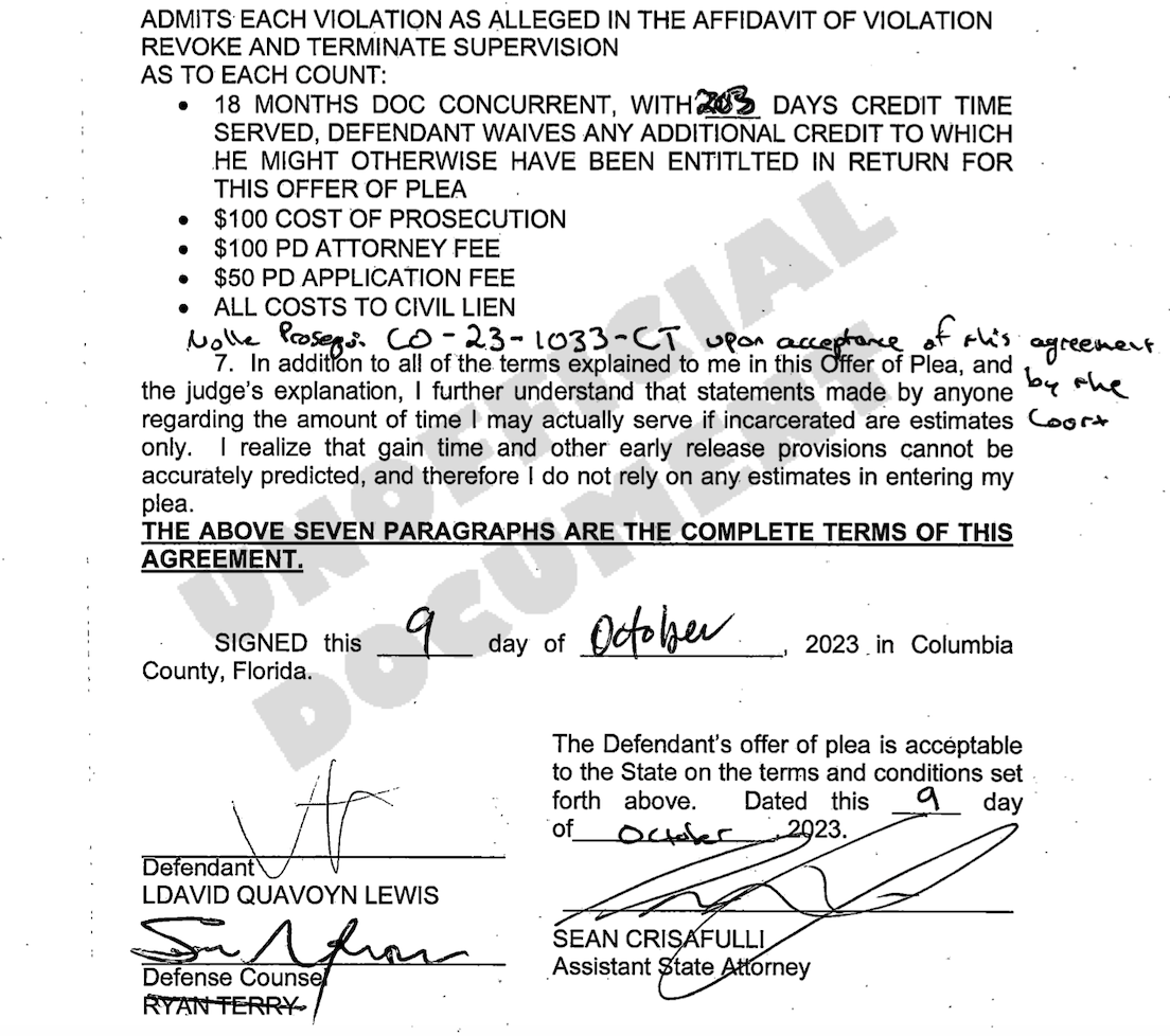 According to Columbia County Court Records, Lewis was sentenced to 18 months in prison in October 2023 for violating his probation in a case where he was convicted of habitually driving with a suspended license and possession of a controlled substance.