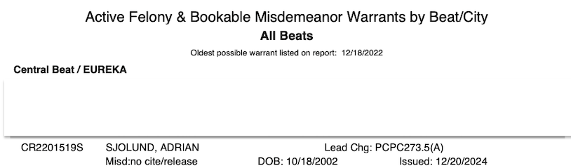 According to a Humboldt County, California government website, Sjolund has an active warrant within the jurisdiction of their sheriff's office