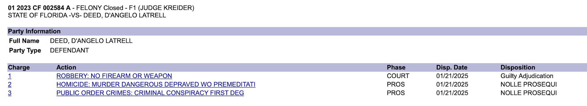 Update 3| Dec 2, 2023: Deed was not prosecuted for homicide but was convicted of robbery without a firearm or weapon and sentenced to nine years in prison in a plea deal. He is currently incarcerated in Union Work Camp.
