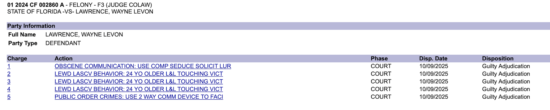 On September 9, 2025, represented by Criminal Defense Attorney John Ramsey, Lawrence appeared in court for a change-of-plea hearing. Lawrence entered an open no contest plea, meaning he decided to not dispute the charges and gave Judge James Colaw discretion on sentencing.